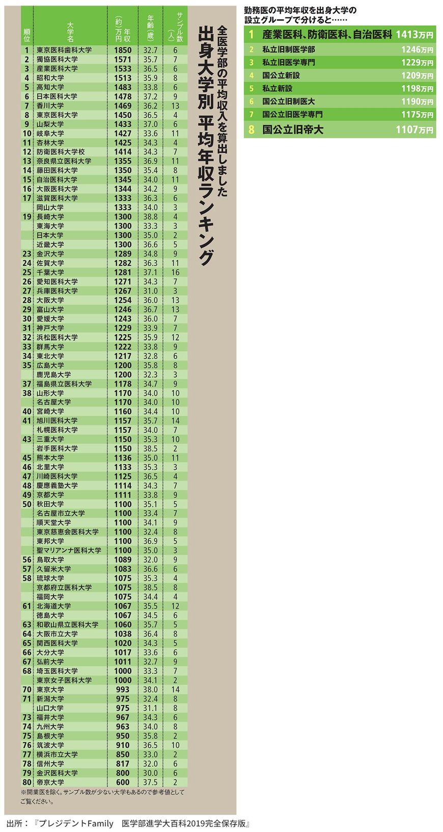 では、出身大学別年収(平均)はどうか。調査サンプル数が少ない大学もあるので、注意が必要だが、1位は東京医科歯科大で1850万円、2位は獨協医科大で1571万円、3位は産業医科大で1533万円だった。