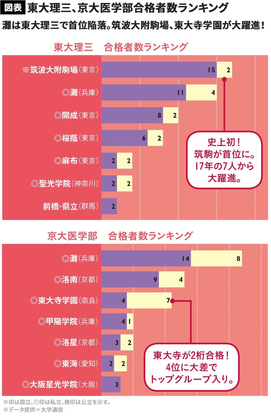 注目点は、何といっても筑波大附駒場だ。東大理三への合格者数が、17年の7人から17人へと急増した。