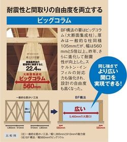 ではなぜBF構法の家は、構造にかかわる壁が少なくてすむのか。鍵を握るのは「ビッグコラム」と呼ばれる幅広の柱。これが主要構造材となっているからなのだ。一般的な木造住宅で使われる柱が105mm角であるのに対し、ビッグコラムは105×560mm。なんと、約5倍の幅がある。壁倍率に換算すると22.4倍相当と、高い耐震性能を誇る。