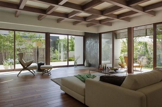 大スパン格子状床梁がダイナミックに空間を演出するスローリビング。光や風、庭の景色をいつも身近に感じられる。