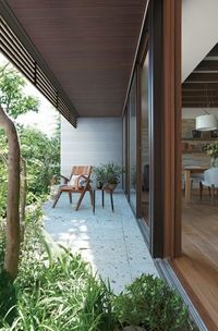 大開口と軒下空間の組み合わせから生まれるこの「スローリビング」では、天井の格子梁や柱、床の木の質感も雰囲気を演出する。