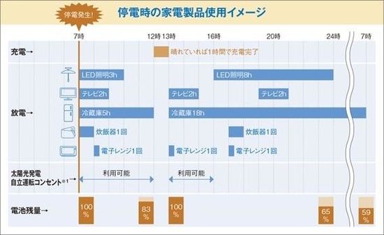 これにより、停電時でも照明や情報収集のためのテレビ、食事のための冷蔵庫や炊飯器、電子レンジなど、必要最低限の電力が確保できることとなった。