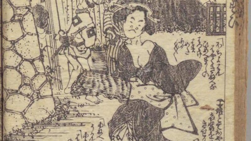 ▼図版1に、夜鷹のいでたちが描かれている。画中に「辻君於利江」とあるが、辻君は夜鷹の別称。要するに、「夜鷹のお利江」である。