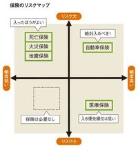 どんな保険が必要であるのかないのかを判断していくのには、図の“リスクマップ”を活用するといい。これはリスクの大小を縦軸に、そのリスクの発生頻度を横軸にとったもの。リスクが大きくて、発生頻度が高いものが自動車の事故である。もし読者のあなたがマイカーを運転しているのなら、必ず自動車保険に入っておいたほうがよい。