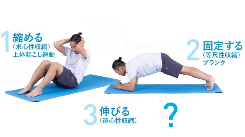 腹筋には「縮める」「伸びる」「固定する」という三つの働きがあります。「縮める」は上体起こし運動、「固定する」はプランクが相当します。では、「伸びる」に該当するものは何か?