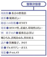 倍音とはある音が鳴ったときに共鳴したり、付随して出てくる音のこと。楽譜上では同じ音でも楽器によって音色が違うのは、含まれる倍音が異なるからです。実はこの倍音は人間の声にも存在し、それが個々の声質を決めているのです。