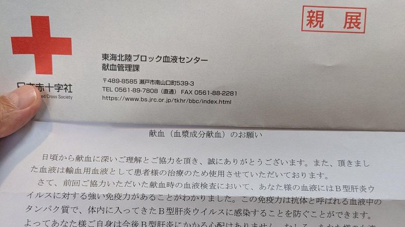 先日、SNSのX(エックス)で、献血後に日本赤十字社から「あなた様の血液にはB型肝炎ウイルスに対する強い免疫力がある」という手紙が届いたという投稿が注目を集めました(※1)