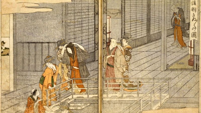 女郎の一日は、同衾した客を送り出すところから始まります。客が着物を着だす頃、女郎も起き上がって、客の羽織を着せかけ、自らも寝間着の上から着物を引掛け、客を見送ります。