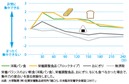 一方、きちんと栄養バランスの良い朝食(洋風パン食)をとると、高い集中力を長時間にわたって維持できていることがわかる。つまり、「脳の活性化には、栄養バランスが最も大切である」という事実が、実験によって初めて証明されたのだ。