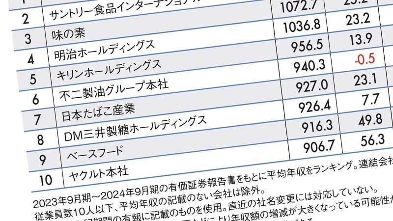 プレジデントオンラインは、東証33業種の「食料品」に分類される企業123社の「社員平均年収ランキング(2024年版)」を作成した。