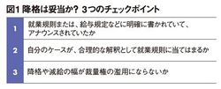 降格が妥当かどうかを検証する際、ポイントは3つある。まず就業規則や給与などの諸規定にそのことがちゃんと明記されているかどうか。次に、就業規則上の降格事由にそれらしい文言があったとしても、自分のケースがそれに当てはまるといえるのかどうか。そして3番目に、大幅な減額が会社の裁量権の濫用に当たらないかどうかである。