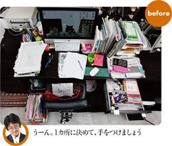 自他ともに認める片づけ下手の編集者、内山雅代さん。デスクは不潔ではないが、大量のモノや書類が無造作に置かれてある。PCのマウスを動かすスペースすらほとんどない。