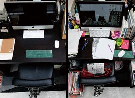 自他ともに認める片づけ下手の編集者、内山雅代さん。デスクは不潔ではないが、大量のモノや書類が無造作に置かれてある。PCのマウスを動かすスペースすらほとんどない。