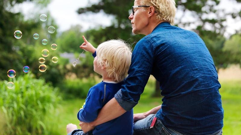 屋外でシャボン玉を見る父と息子