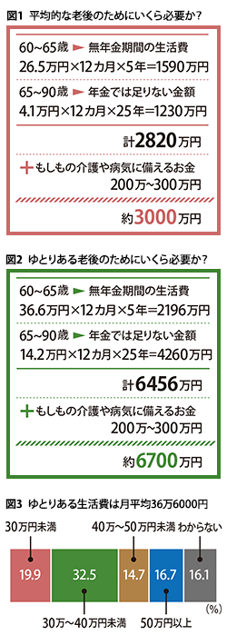60歳まで生きた男性の平均寿命は82.84歳、女性は88.37歳まで生きるという統計(2010年簡易生命表)がある。余裕を持たせて夫87歳、妻92歳まで生きると仮定し、最低限の生活のためには月24万円、ややゆとりある生活のためには月30万円かかるとすると、最低限生活では1億776万円、ゆとり生活では1億1856万円確保しなければならない。しかし年金が7274万円支給されるので「不足分は最低限生活で3502万円、ゆとり生活で4582万円になります」。