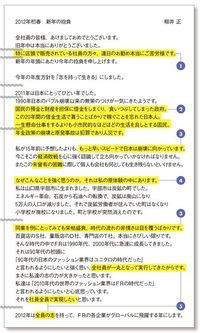 2012年に送られたメールは、A4用紙にして3枚前後。話題と語り口は年ごとに異なるが、全体の構成はほぼ共通している。まず冒頭で、前年の業績や自社を取り巻く経営環境を振り返りつつ、トップとして抱く危機感、それを踏まえた今年の標語が示される。後半は、全社員一丸となって目指す会社の姿、1人ひとりに期待するマインドが訴えかけられる。表現も次第に社員の心を揺さぶるような熱気を帯びてくる。