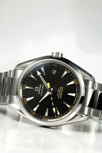 「シーマスター アクアテラ “15000ガウス”」。耐磁性能を備えた独自開発のコーアクシャルムーブメント、Cal.8508を搭載。通常の耐磁時計と違ってインナーケースが不要なのでケース裏からムーブメントを見ることができる。