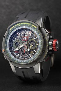 「RM39-01」。フライトコンピューター「E6-B」をベゼル部分に取り入れた。燃料消費や離着陸時に不可欠な密度高度の測定が可能。協定世界時表示、カウントダウン機能、フライバッククロノグラフを備える。