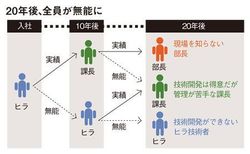 それにしてもなぜこんなことが起きるのだろうか。たとえばある年に5人の新入社員が半導体の技術者として配属されたと仮定しよう。入社十数年を経ると彼らの中から課長に昇進する者も現れる。しかし、課長になったとたんに「無能化」する者が出てくる。なぜなら昇進するのは技術で功績を挙げた者だが、彼らにマネジメント能力が必ずしもあるわけではないからだ。さらに昇進を機に現場の技術から遠ざかってしまう。