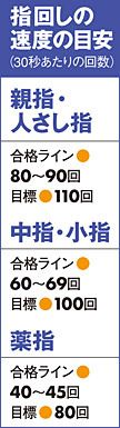 もうひとつは、敏しょう性(速さ・スピード)。30秒間に何回回せるかで調べることができる。敏しょう性は頭の回転の速さと関係しており、これを求めるときは指同士が触れても、ドームが崩れても構わないという。崩れてしまったら、元に戻して再度チャレンジすればいい。スピードの追求に徹するのみ(回数の目安は図を参照)。勉強やテスト前の「さあ、やるぞ!」というときは敏しょう性を重視するとよいそうだ。