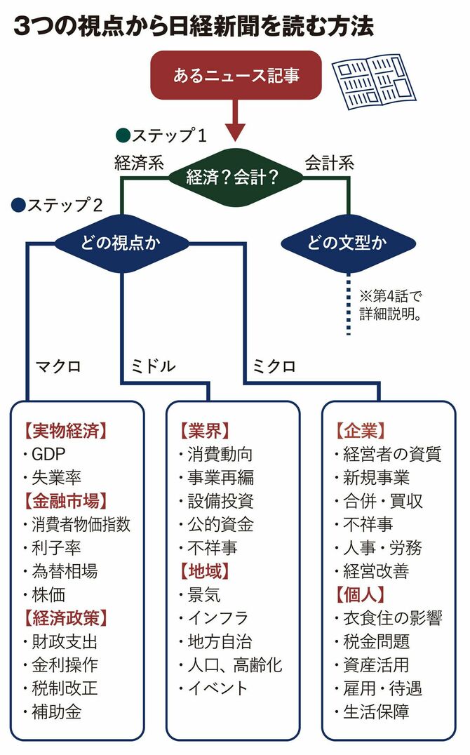 ビジネスパーソンの貴重な情報源となっている「日本経済新聞」ですが、「経済ニュースはとっつきづらいし、わかりづらくて困る」と言う人が少なくありません。そう思ってしまう大きな原因は、記事の内容が持つ意味を整理できないことにあります。そこで、おのおのの記事の持つ「影響の大きさ」から、「マクロ」「ミドル」「ミクロ」という3つの段階に切り分けてみましょう。