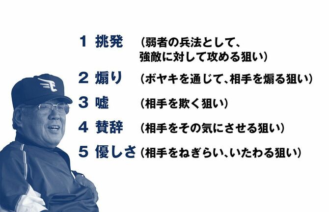 「挑発」について野村は、宮本武蔵の『五輪書』を引用しつつ、「剣が体を攻めるものなら、言葉は相手の心を攻撃することができる」と述べている。戦力で劣るのならば、「言葉」という武器をいかに活用するか? そんな思いがあったからこそ、野村は貪欲に言葉を持つように努めていたのである。
