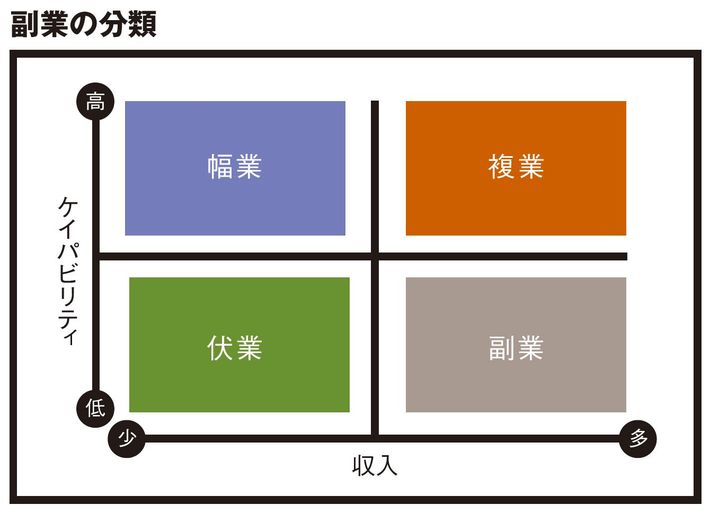 「伏業」は、会社に伏せて行う内職やアルバイトなどの仕事です。残業の削減・禁止の流れが進む中、経済的事情でこの種の副業をせざるをえないケースもあります。時給換算すると、会社の残業代より少ないことも多く、ケイパビリティも高まりません。