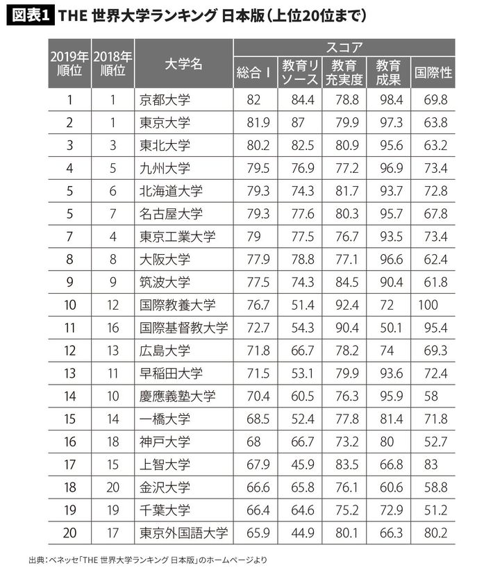 図に「THE 世界大学ランキング 日本版」の上位20位までを紹介したいと思う。なおスコアの規準は次のとおりだ。