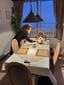 自宅のダイニングにて。どんなときでも、1人で赤ワインで晩酌。