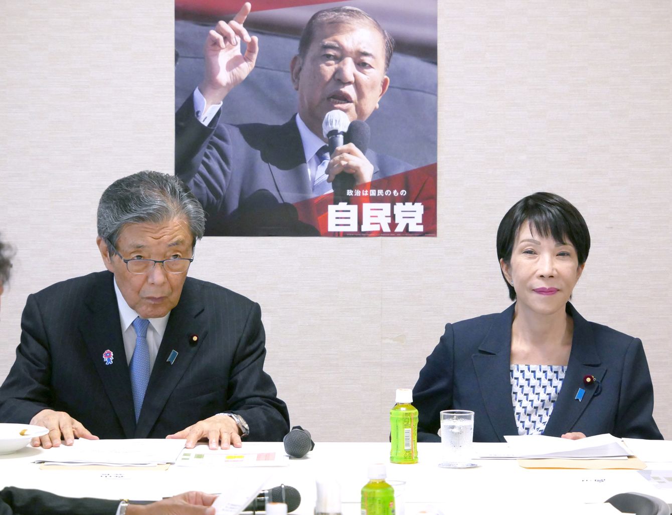 自民党「漬物振興議員連盟」総会に出席する森山裕幹事長(左)と高市早苗・前経済安全保障担当相。2025年6月5日、東京・永田町の同党本部