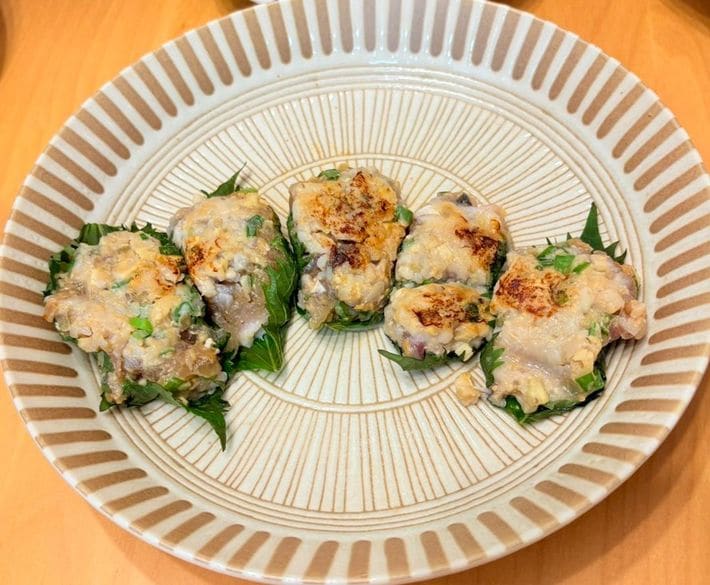 ミズカマスの酢締め、たたき、なめろう。友人宅の食器のおかげで見栄えがする品々になりました
