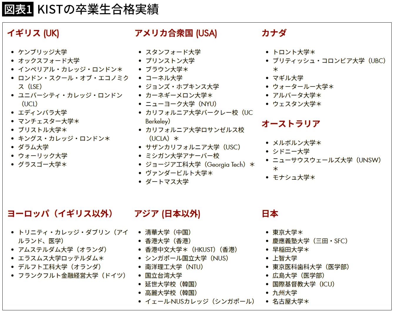 2020年以降の卒業生が合格した大学。*印は奨学金が授与された大学(