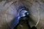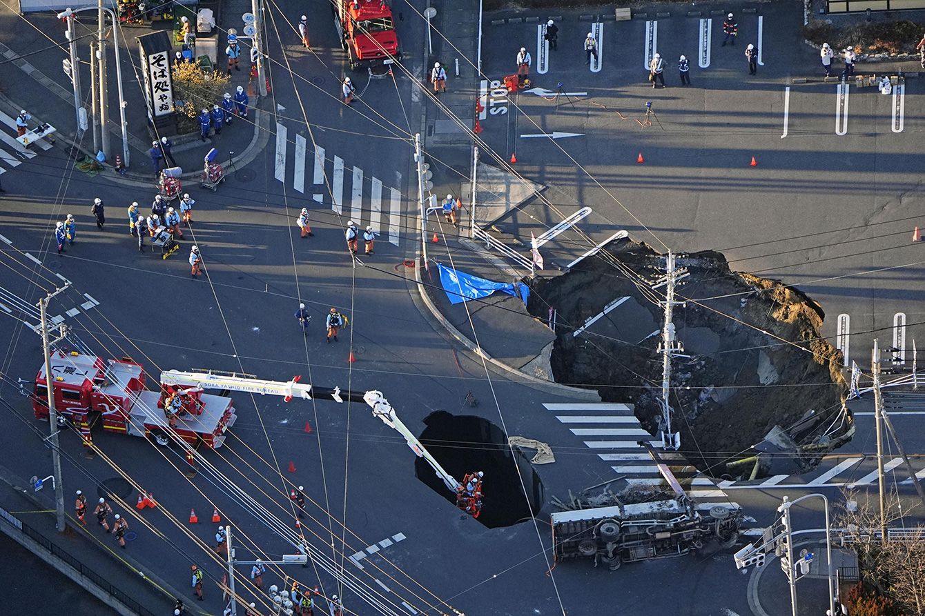 道路が陥没し、トラックが転落した現場で続けられる救助活動。右は未明の作業中に新たに発生した陥没=2025年1月29日、埼玉県八潮市(共同通信社ヘリから)