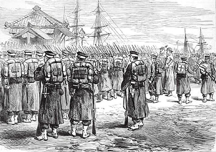 西南戦争に向かうため、横浜港に集まる帝国陸軍。