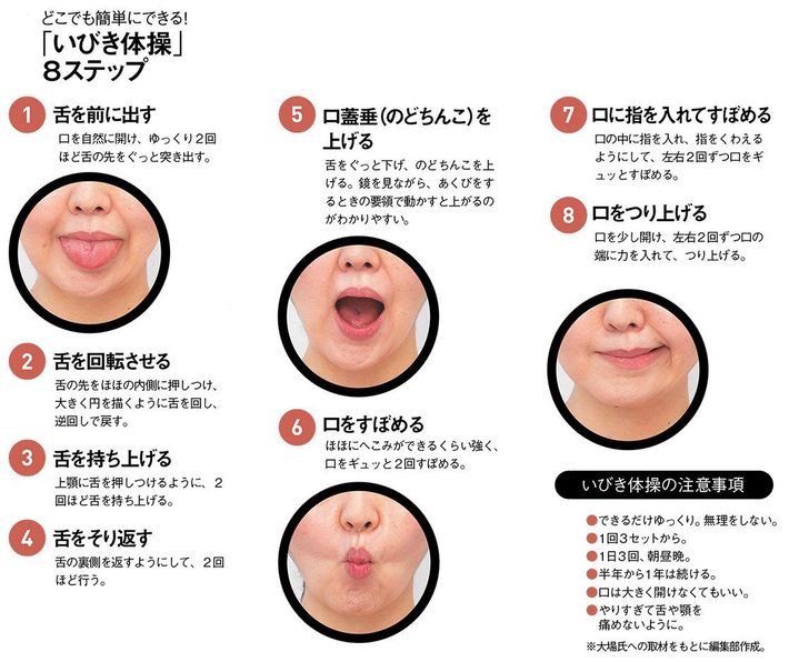 ブラジルのギマラエス教授が提唱する「いびき体操」。体操を行うことで、口の周りや舌の筋肉を鍛え、舌の支えを強くすることで、寝ているときに舌が落ちてのどの奥の空間が狭くなることを防ぐ。 (注)神経学的に異常のある人や口腔内・顎に異常のある人は医師の指導の下に行う。 (注)体操はいびき・睡眠時無呼吸症の治療を補助するものです。