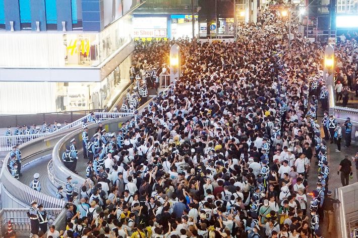 道頓堀川に架かる戎橋に集まった阪神ファンと警備する警察官=2023年9月14日午後、大阪市中央区