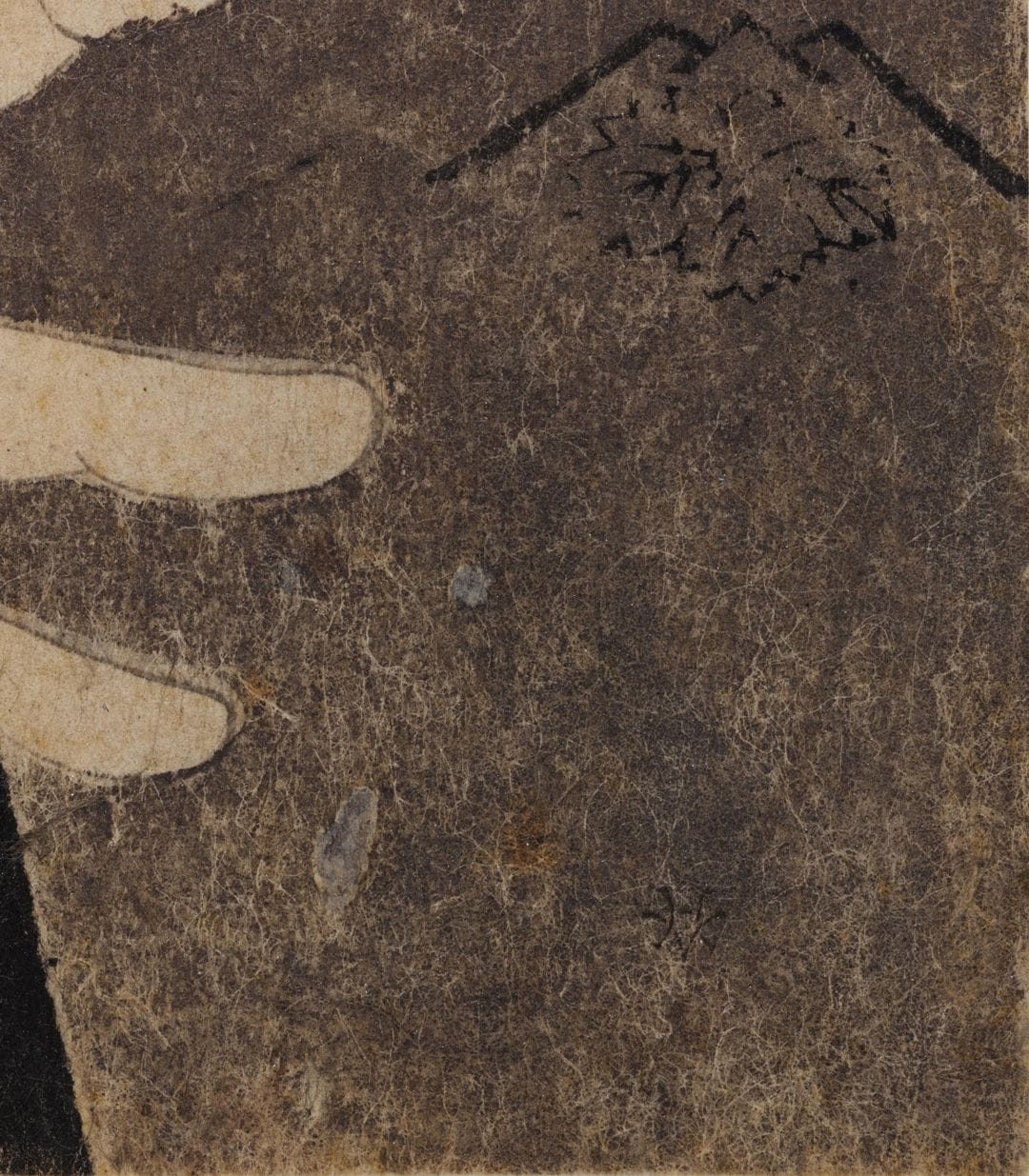 「三代目大谷鬼次の江戸兵衛」(部分)、版元である蔦屋の屋号が記されている(出典: