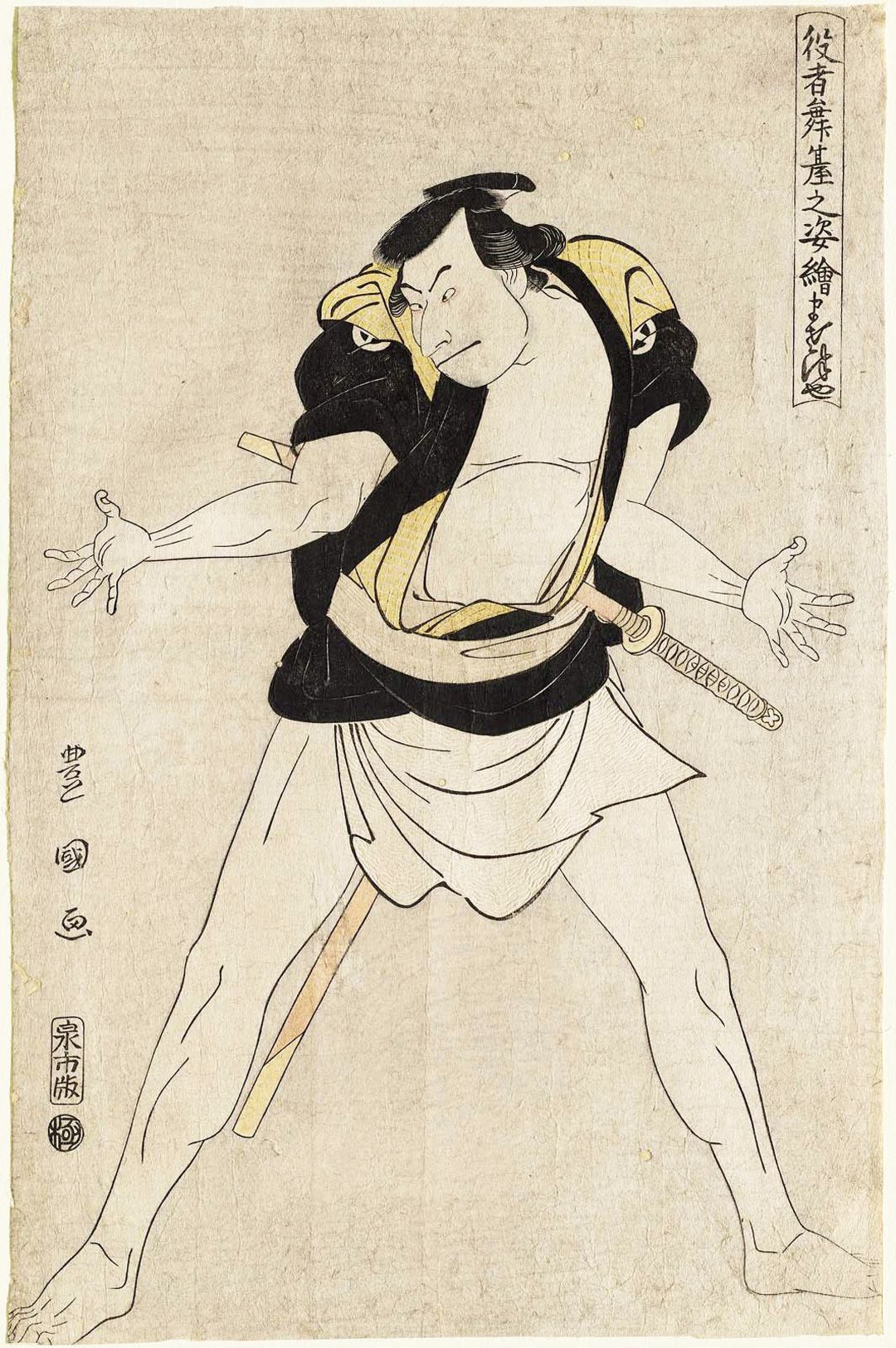 写楽の上の絵と同じく、三代目大谷鬼次が演じる江戸兵衛を描いた。歌川豊国「役者舞台之姿絵 まさつや」(