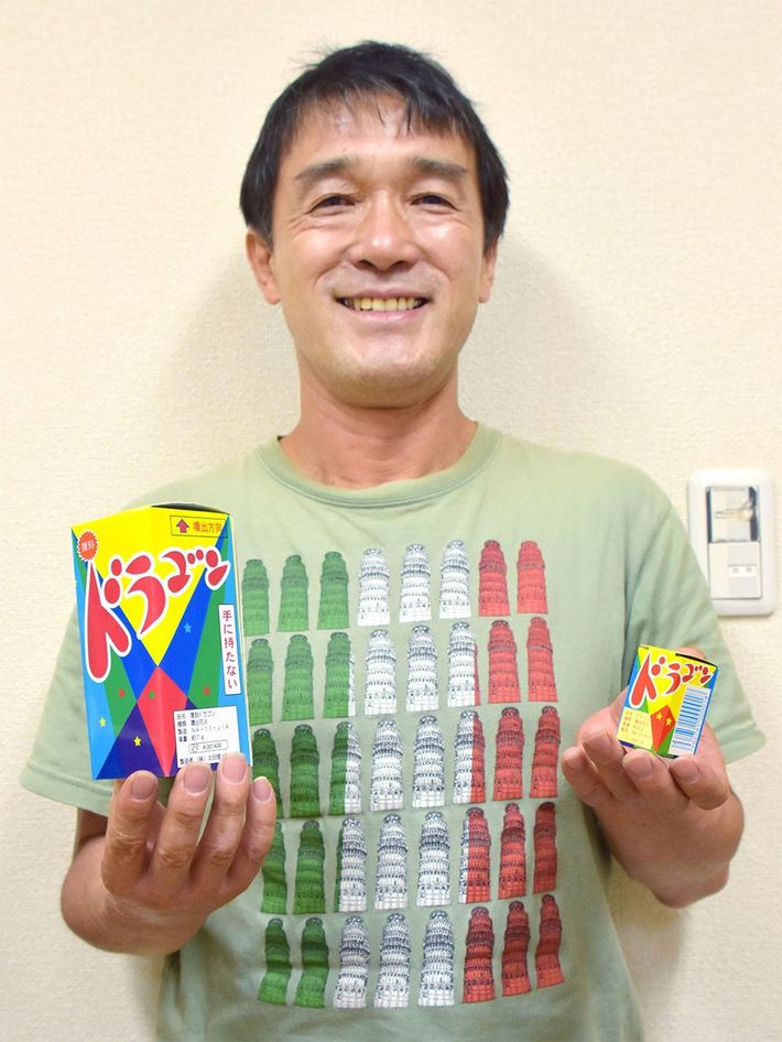噴出花火「ドラゴン」を手にする太田煙火製造所の太田恒司社長=2016年8月2日、愛知県岡崎市