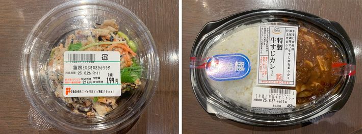蓮根とひじきのおかかサラダ 214円(左)、特製牛すじカレー 494円(右)いずれも税込み