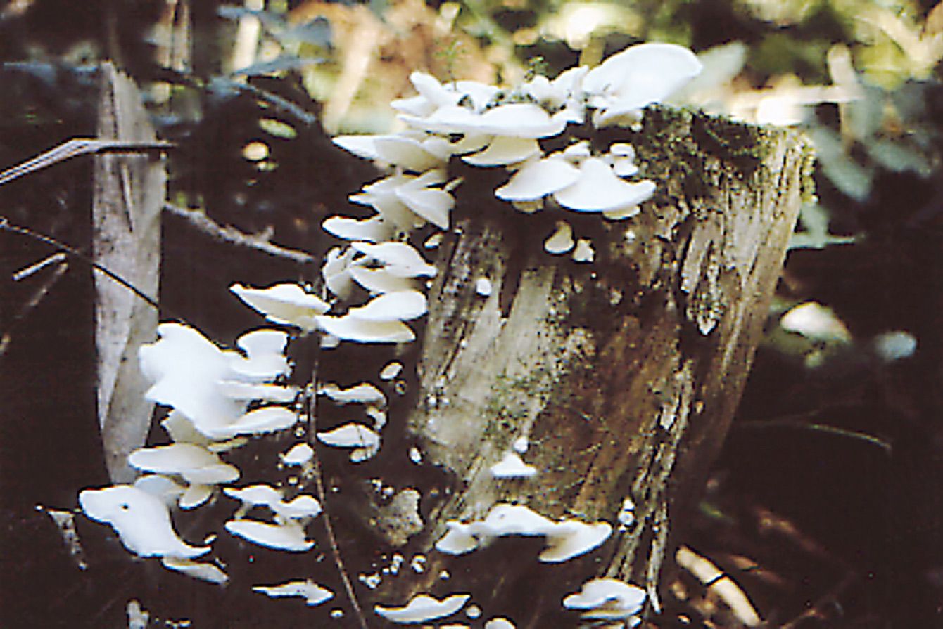 群生するスギヒラタケ。以前は食用とされていたが、急性脳炎や脳症を引き起こすことがわかり、今では食べられなくなった。