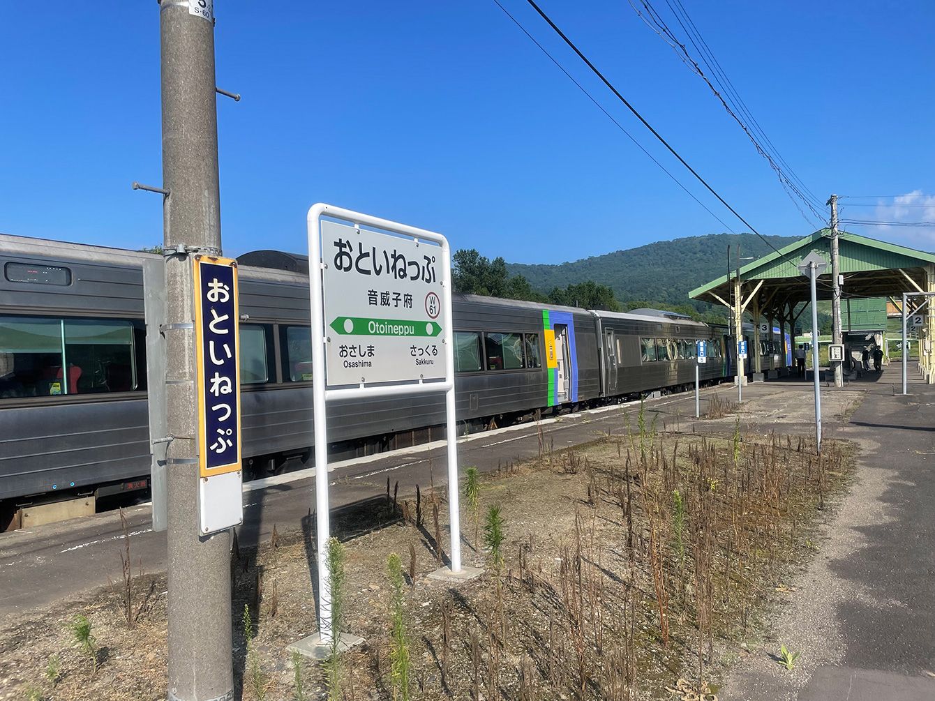 夏の晴れ渡る青空の下、音威子府駅に停車中の特急サロベツ
