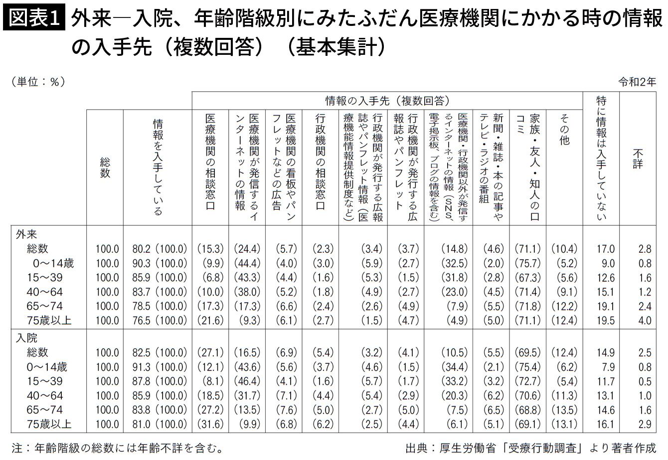 外来―入院、年齢階級別にみたふだん医療機関にかかる時の情報の入手先(複数回答)(基本集計)[出所=『