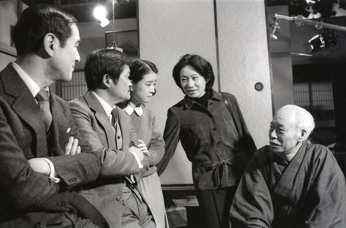 ドラマ「あ・うん」の出演者と一緒の向田邦子。左から杉浦直樹、フランキー堺、岸本加世子、向田邦子、志村喬