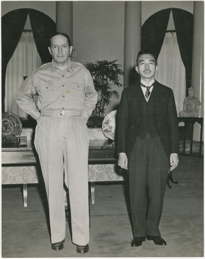 1945年9月27日、東京の米国大使館で行われた昭和天皇とマッカーサー元帥の初会談(写真=Densho Digital Repository/ジェターノ・フェイレース/PD US Army/