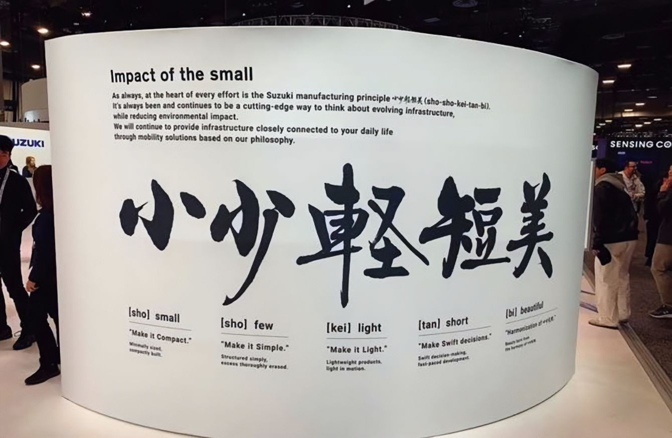 CES2025でスズキのブースで掲示された「小・少・軽・短・美」の5つの漢字。