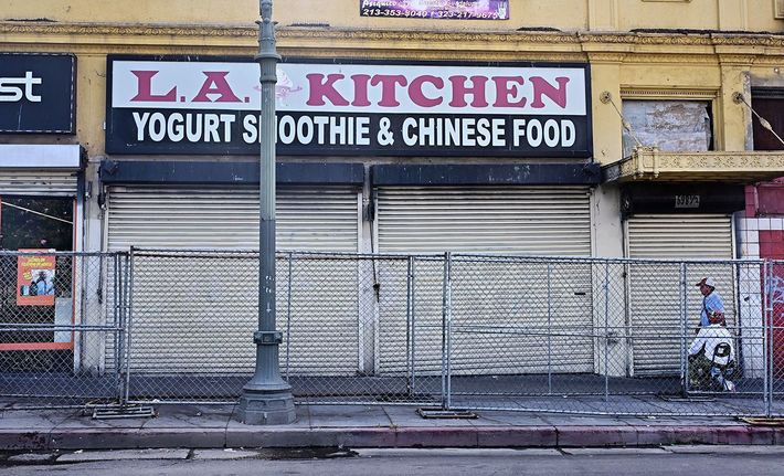 2025年8月13日、カリフォルニア州ロサンゼルスのマッカーサー公園周辺で、金属製のバリケードや閉店した店舗の前を通り過ぎる歩行者