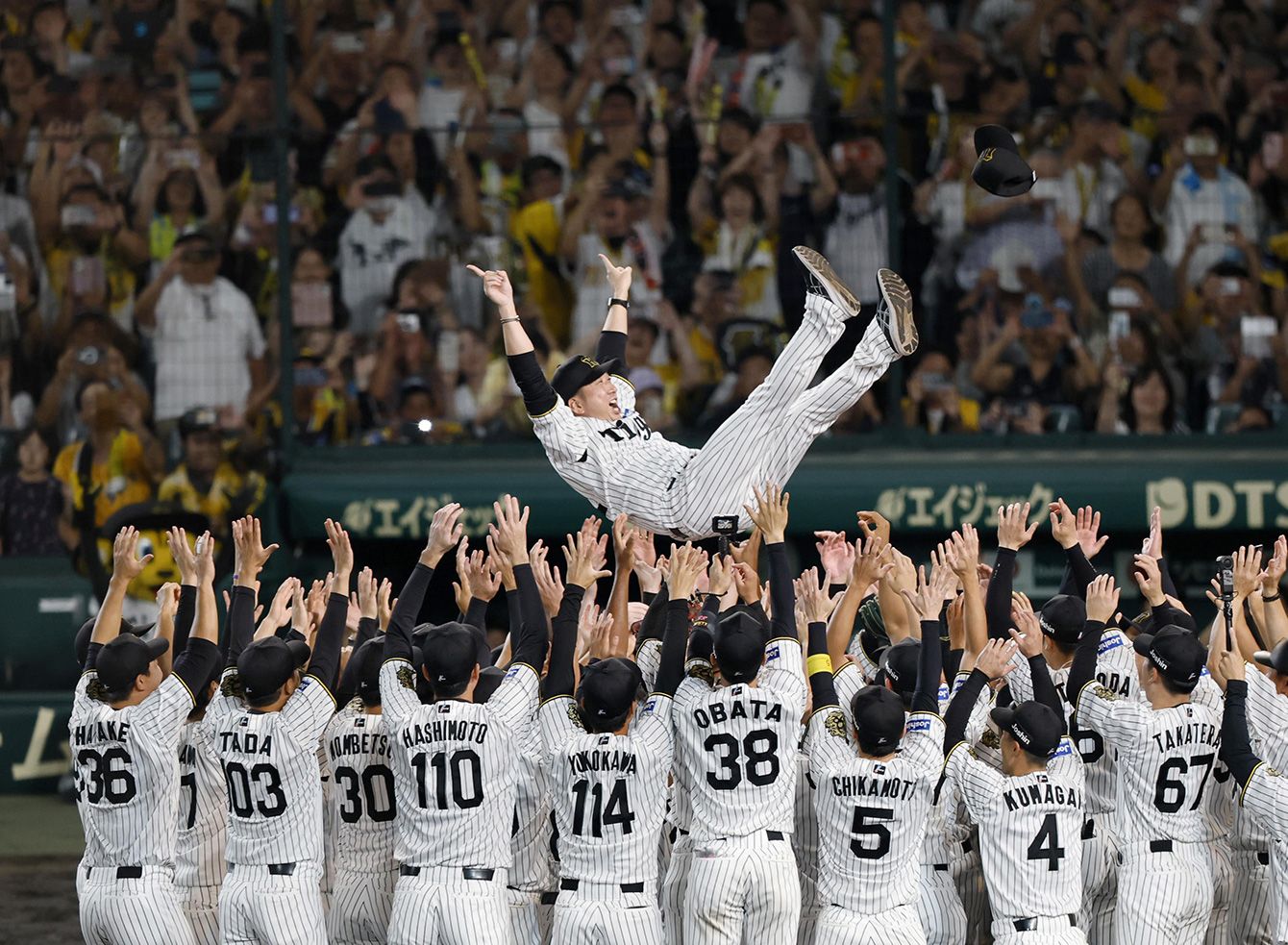 リーグ優勝を決め、胴上げされる阪神・藤川監督=2025年9月7日、甲子園