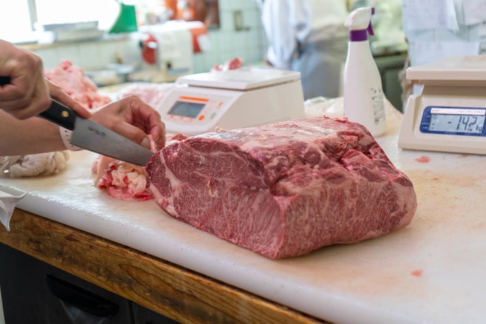 カットした牛肉をトレイに並べる新田さん