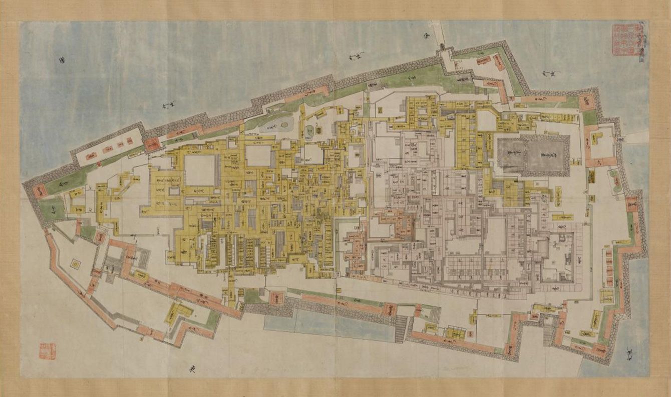 右側の白い部分が大奥で、左の黄色の部分は政務を司る場所だ(画像=「江戸城御本丸御表御中奥御大奥総絵図」